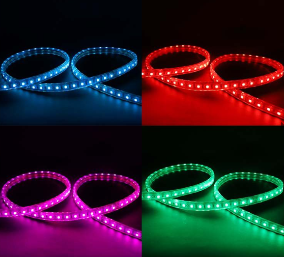 Ruban led PVC, RGB, dimmable avec télécommande, IP65, livré avec câble d'alimentation, contrôleur et télécommande.